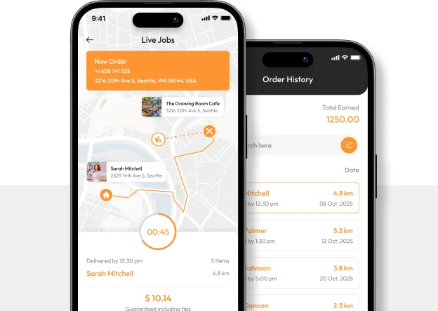 Our rider apps are built for speed, reliability, and operational clarity. Delivery agents can access navigation support, delivery queues, status updates, earnings summaries, shift controls, proof of delivery, and in-app communication to complete orders with greater accuracy.